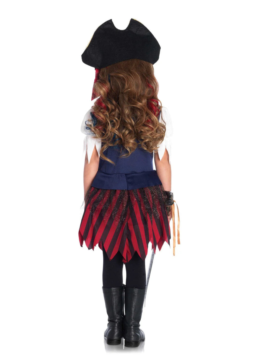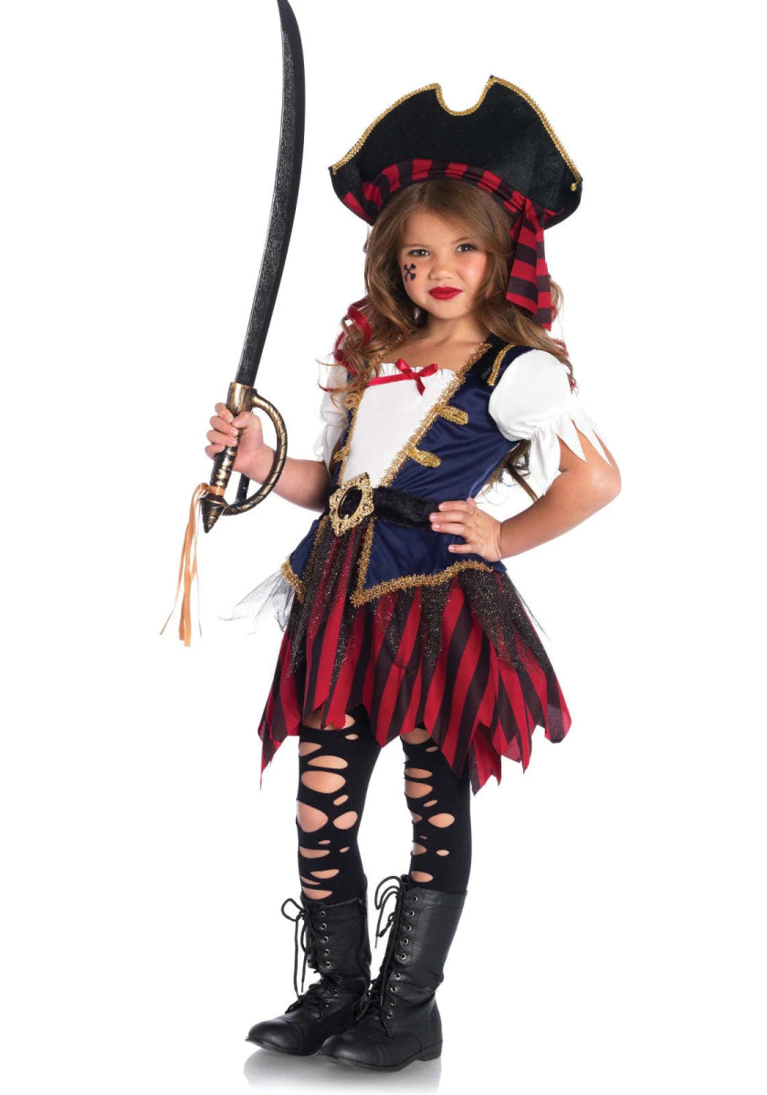 Kleine Mädchen werden zu großen Abenteurern in diesem Karibischen Piratenkostüm. Dieses zweiteilige Piratenset besteht aus einem goldverzierten Kleid mit angebrachtem Gürtel und einem passenden Piratenhut mit Halstuch. Perfekt, um der Kapitän deines eigenen Schiffes zu werden! ⚓🌊