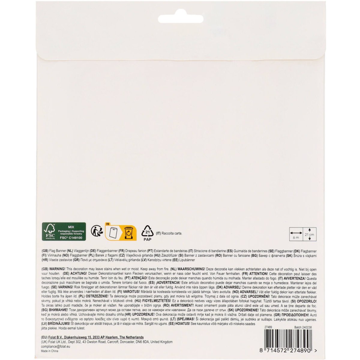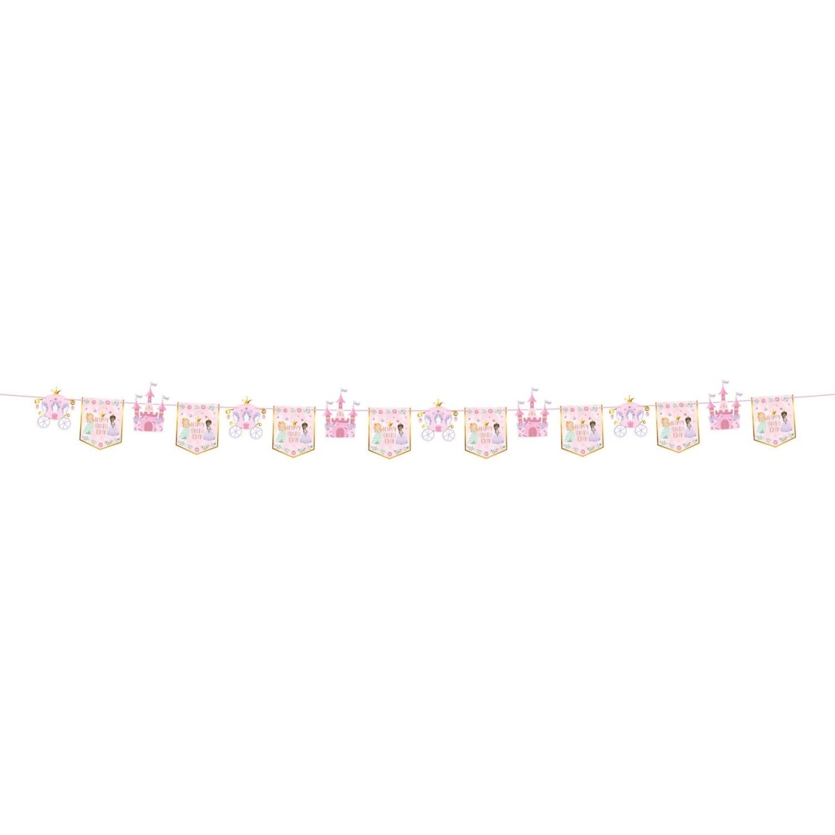 Für zauberhafte Prinzessinnenpartys. Fahnenleine - Pretty Princess - 6 Meter. Inhalt: 1 Fahnenleine. Kann zum Beispiel bei folgenden Partys/Partyanlässen verwendet werden: Kinderparty, Geburtstag. Das wird wirklich eine Party für Prinzessinnen! Auf dieser 6 Meter langen Flaggenleine befinden sich 16 Flaggen mit einer Größe von etwa 17 x 21 cm. Es gibt 3 Arten von Fahnen: eine rosa Fahne mit dem Text "HAPPY BIRTH DAY" und zwei Prinzessinnen, eine in Form eines Schlosses und eine in Form einer Kutsche. Alle Fahnen haben ein wunderschönes goldenes Detail, das dank der verwendeten Heißprägetechnik richtig glänzt! Die Fahnen sind auf beiden Seiten bedruckt. Sie können über das rosa Band hin und her geschoben werden. Diese Fahnenserie gehört zur Pretty Princess Kollektion von