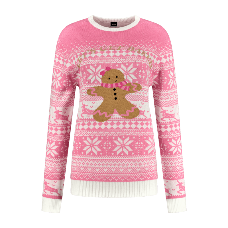 Mit diesem Pinken Lebkuchen-Weihnachtspullover für Frauen bringst du sofort eine fröhliche und süße Weihnachtsstimmung in dein Outfit. Der Pullover hat ein verspieltes Design mit niedlichen Lebkuchenfiguren auf einem zartrosa Hintergrund und hebt sich damit von all den traditionellen Weihnachtsfarben ab. Perfekt für alle, die einen frischen, modernen und festlichen Look lieben.