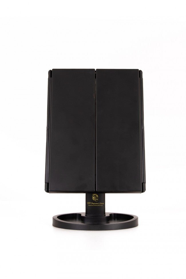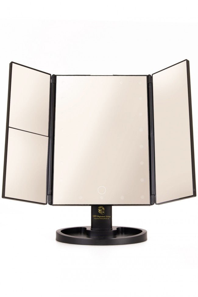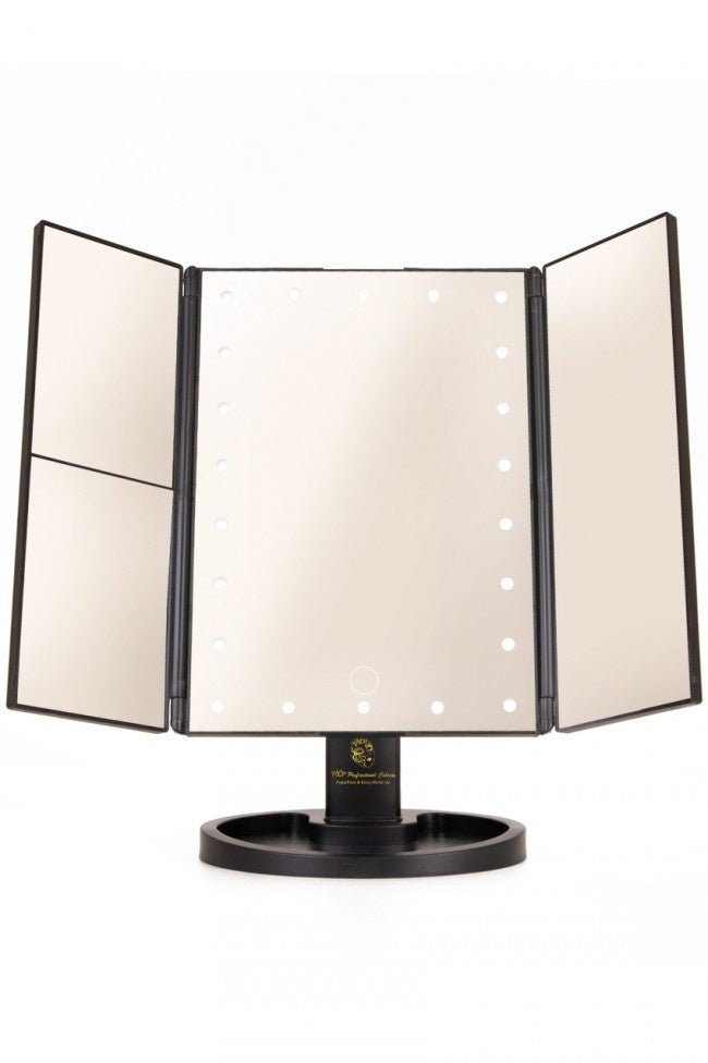Mit diesem beleuchteten Spiegel wird dein Make-up/Schminken von nun an immer richtig sein. Dieser Spiegel enthält eine LED-Beleuchtung, so dass dein Gesicht immer perfekt ausgeleuchtet ist und du kein Detail verpasst. Durch das dreiteilige Design ist der Spiegel faltbar und leicht zu transportieren. Die Beleuchtung wird mit 4 AAA-Batterien betrieben, so dass du den Spiegel überall hinstellen kannst, aber du kannst ihn auch an ein USB-Kabel anschließen. Abmessungen: - 35 cm x 28,5 cm x 11,5 cm Farben: - schwarz Material: - Kunststoff - Spiegel/Glas Led-Beleuchtung - 4x AAA-Batterie ( Excl ) - oder über USB-Anschluss ( Incl ) Verpackungsmaße: -29 cm x 19 cm x 7 cm Weitere Infos: - 180¡ Drehfunktion - Verwendung im Hoch- oder Querformat - 22 helle LED-Leuchten - 2- und 3-fache Vergrößerung - Praktische Ablage für Make-up etc.