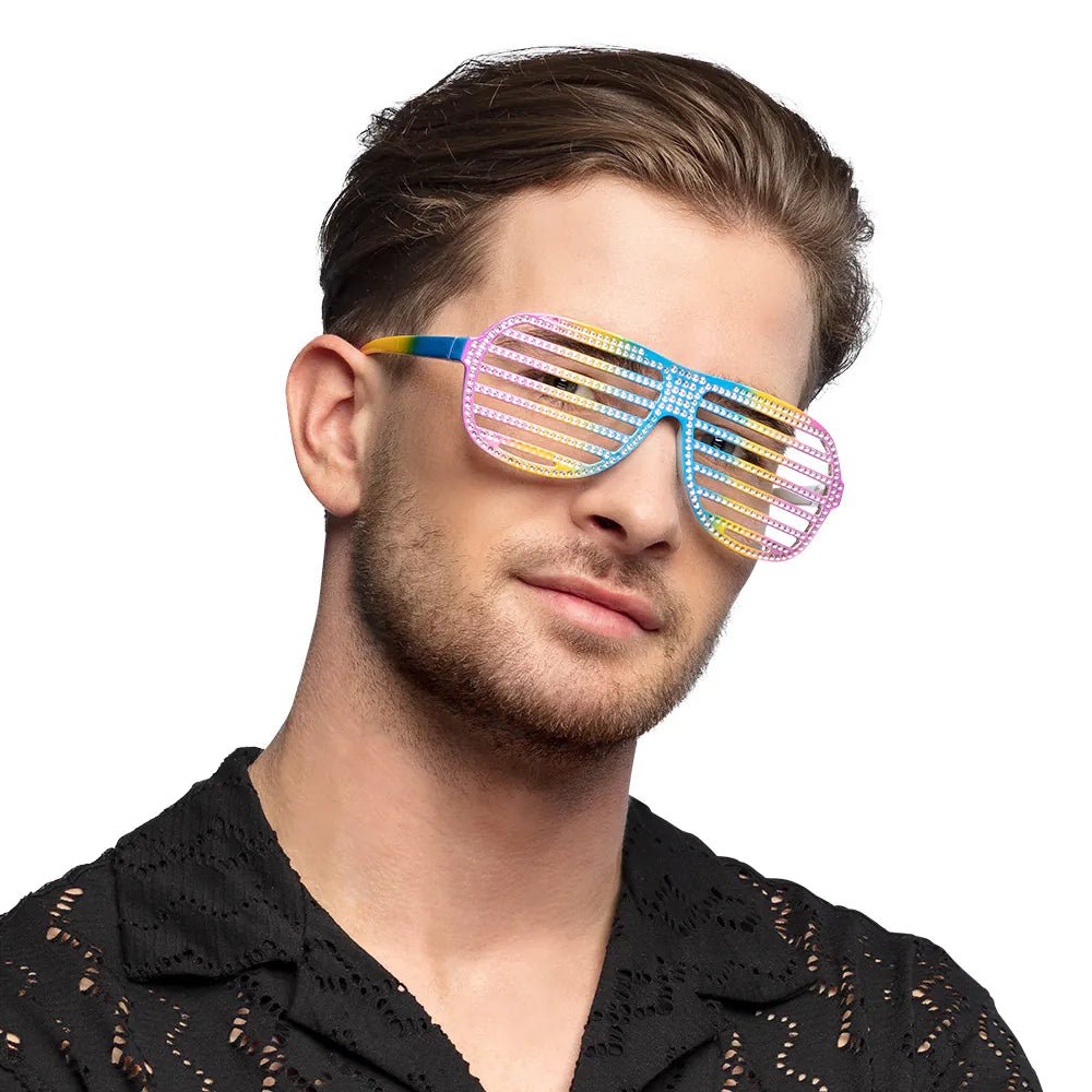 Eine bunte Shutter-Partybrille für Festivalbesucher, Partytiere und 90er-Fanatiker. Die coole Shutterbrille hat fröhliche Regenbogenfarben und ist für einen glamourösen Touch mit glänzenden Steinen verziert. Ein lustiges Accessoire für ein Retro-90er-Jahre-Outfit zu Karneval, einer Verwechslungsparty oder Mottoparty.