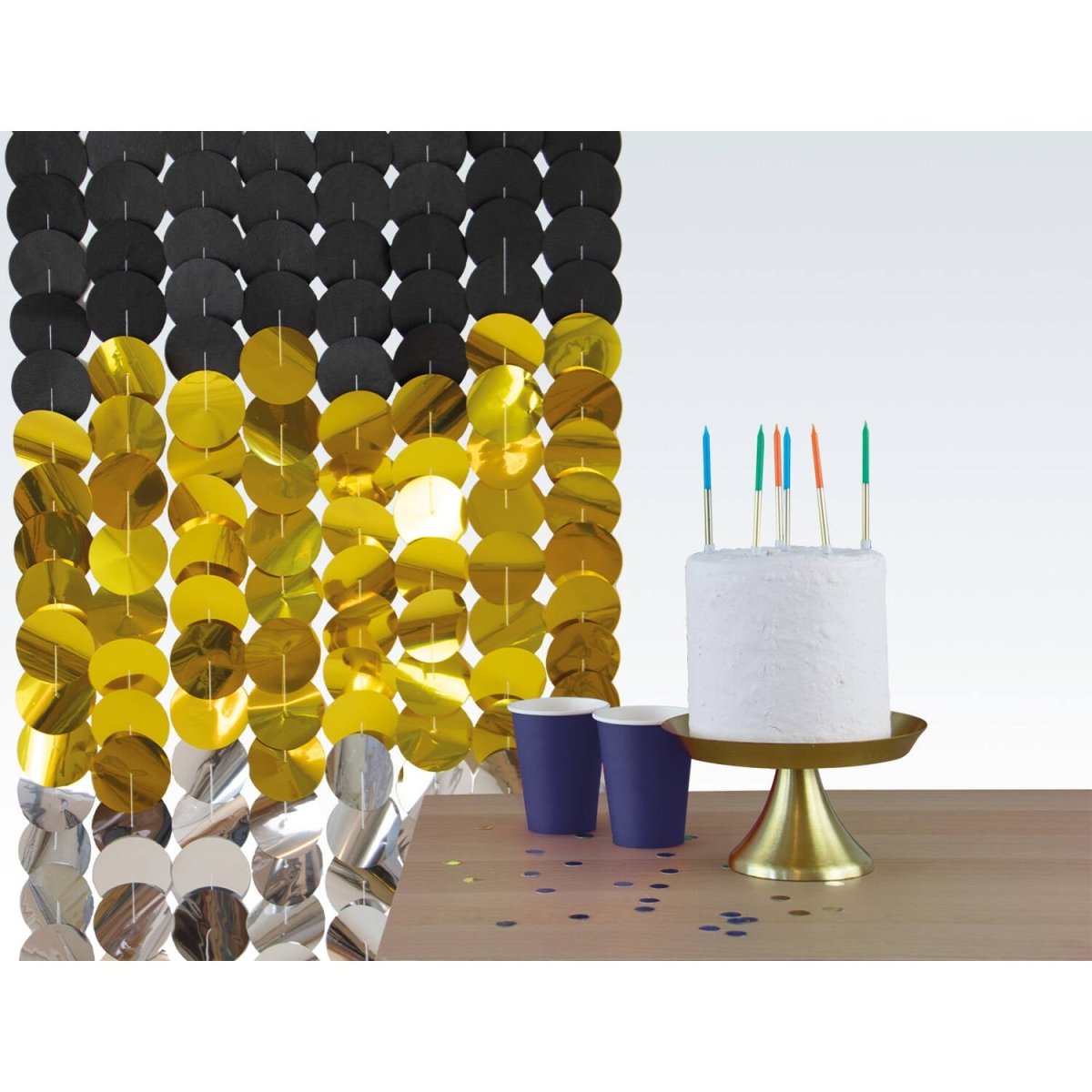 DIY Backdrop Magic. Party Backdrop - "Festliche Galaxie" - Kreis - 80 x 170 cm. Inhalt: 8 Girlanden mit je 18 Kreisen. Zum Beispiel für die folgenden Anlässe zu verwenden: Geburtstag, Themenparty. Dieser Partyvorhang besteht aus 8 Girlanden mit je 18 Kreisen mit einem Durchmesser von 7,5 cm. Hänge sie genau so auf, wie du willst. Wenn du sie nebeneinander aufhängst, entsteht eine 170 x 80 cm große Kulisse. Es gibt 3 Farben für eine Girlande: schwarz, gold, silber. Passt auch gut zu der Shining Glam Kollektion von