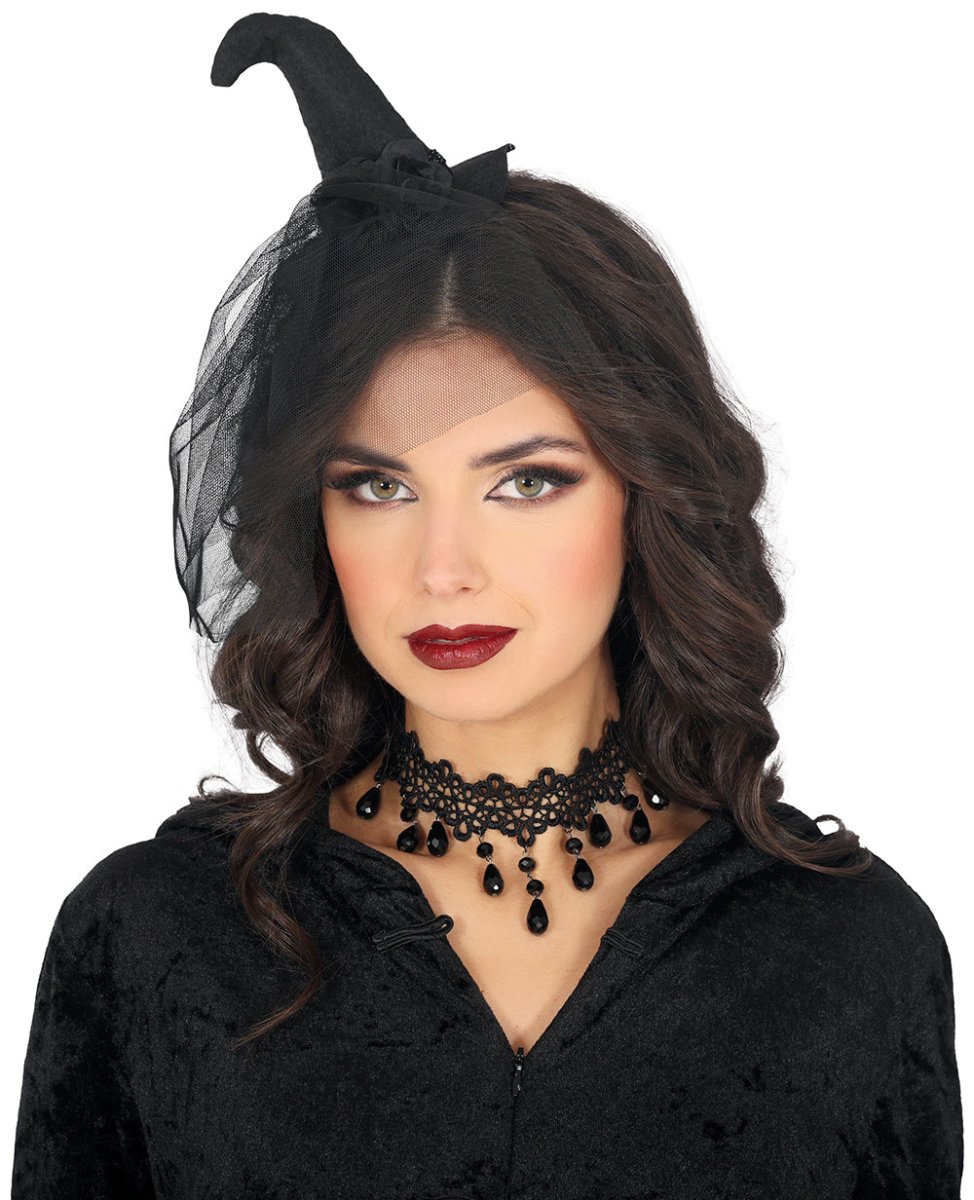 Schwarzer Haarreif Mini-Hexenhut mit Schleier