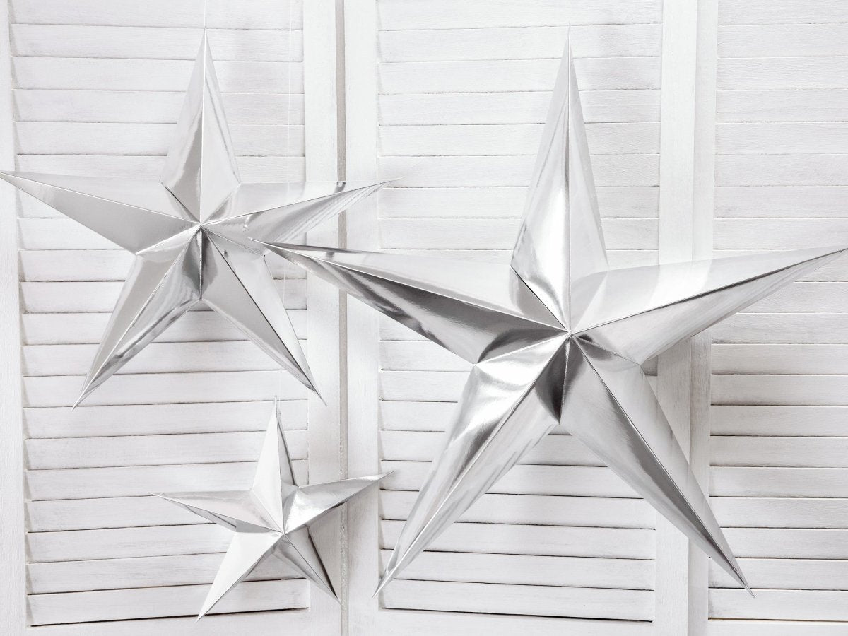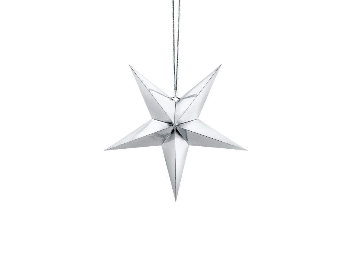 Inhalt: Papierstern, fünfzackig, aus Spiegelsilberpapier, mit Silberschnur, Durchmesser ca. 30cm. Do it yourself Produkt.
