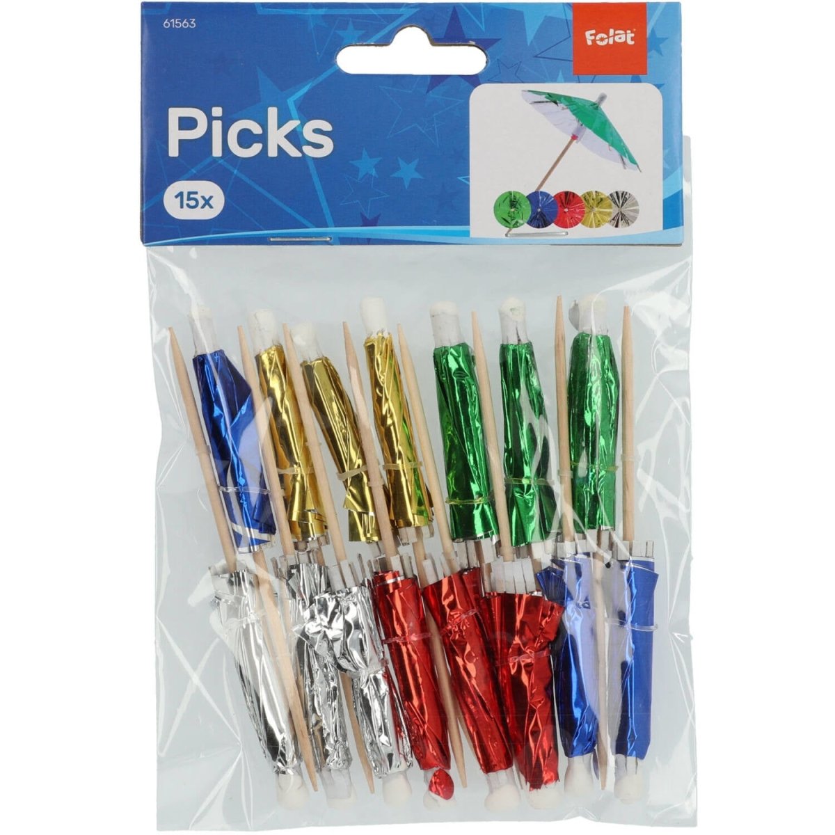 Parasol Prickers Metallic Colours - 15 Stück. Inhalt: 15 Zahnstocher. Farbe: Mehrfarbig Metallic. Zum Beispiel für folgende Anlässe: Geburtstag, Kinderfest, Mottoparty. Diese Zahnstocher sind 14,5 cm hoch. Der Artikel ist aus Bambus hergestellt.