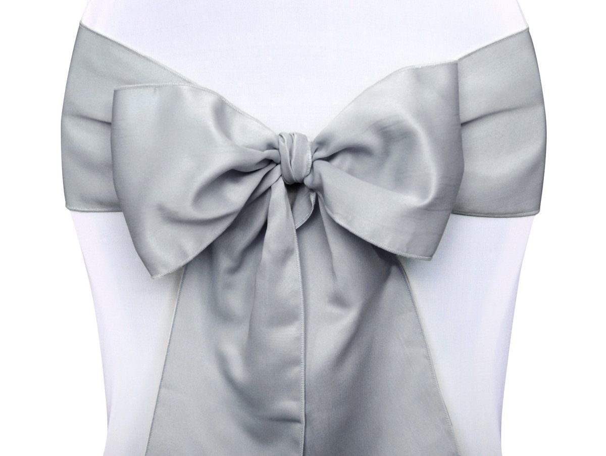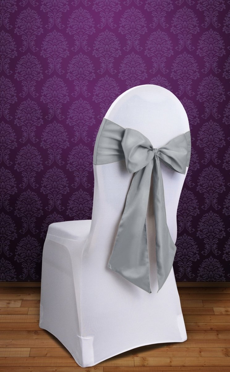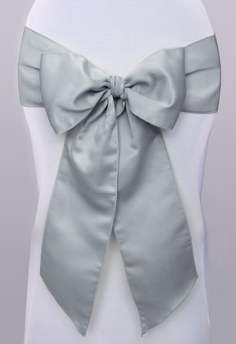 Inhalt: Stuhlschleifen, dicker matter Satin, silber, Länge 2,75 m, Breite 15 cm. (1 HPT/10 Stück)