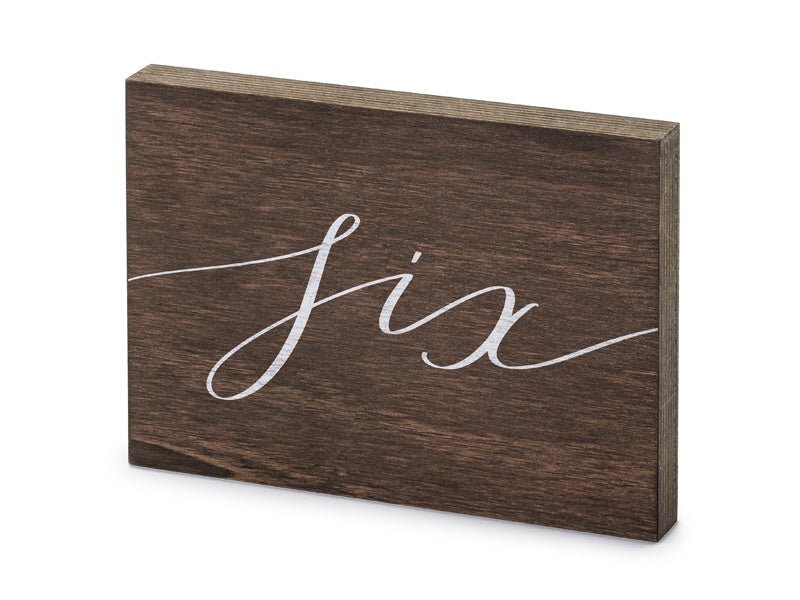 Beschreibung Bewertungen Über dieses Produkt Tischnummer aus Holz mit weißem Schriftzug "Six", Größe ca. 2x18x12,5 cm Trustpilot