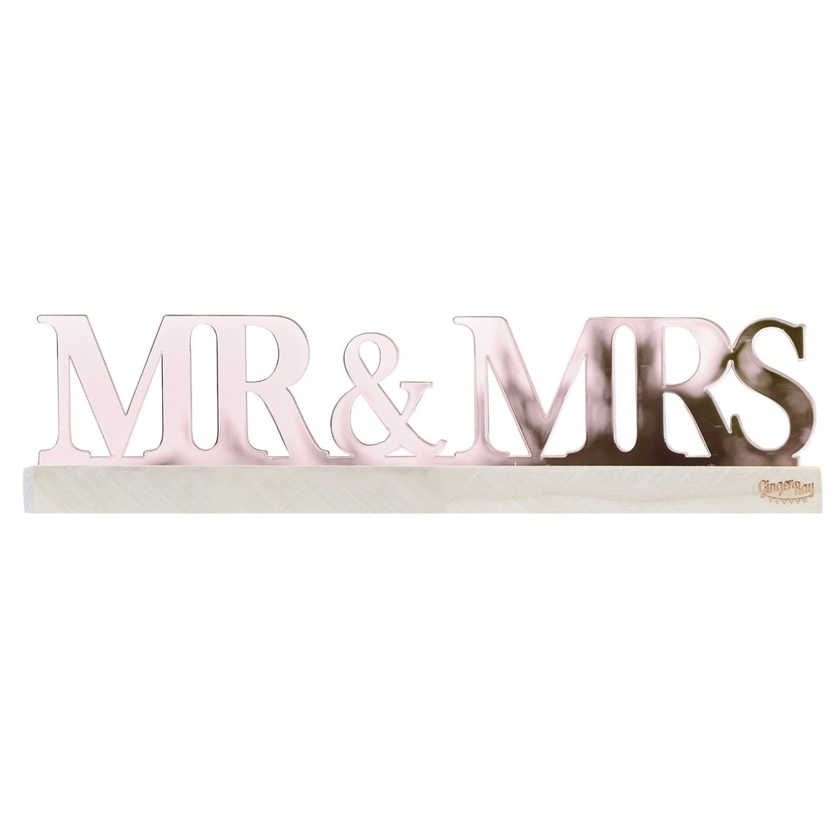 1 x Herr und Frau Schild aus roségoldenem Acryl auf einem Holzsockel mit den Maßen 30cm (B) x 7,5cm (H) x 3,5cm (T).