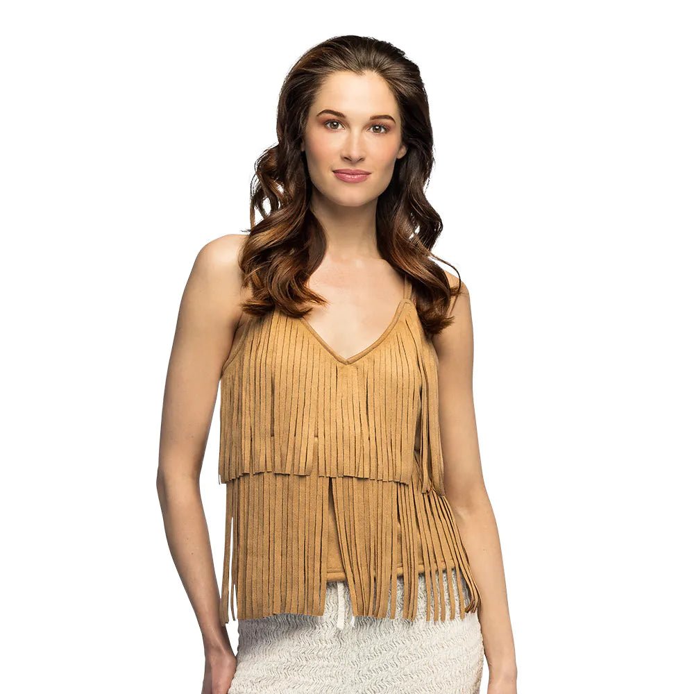 Western trifft auf Boho mit diesem camelfarbenen Fransentop in Wildlederoptik. Das perfekte Oberteil für ein Festival, eine Mottoparty oder eine durchtanzte Nacht. Das verspielte Top hat einen femininen V-Ausschnitt und zwei Lagen mit stylischen Fransen, die den Boho-Look vervollständigen. Das Top ist bequem und einfach zu tragen, ideal für stundenlangen Spaß auf einer Party oder einem Festival.