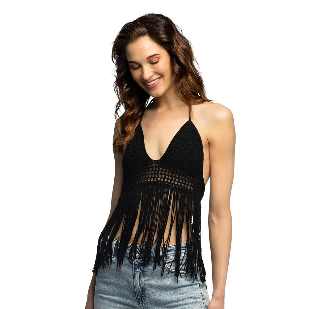 Lass die Sonne scheinen mit diesem süßen schwarzen Häkeltop in Größe M! Das dekorative Muster in der Mitte und die verspielten Fransen am unteren Rand verleihen dem Crop-Top einen echten Boho-Look. Perfekt als Blickfang für Festivals, Strandpartys oder einen sonnigen Tag in der Stadt.