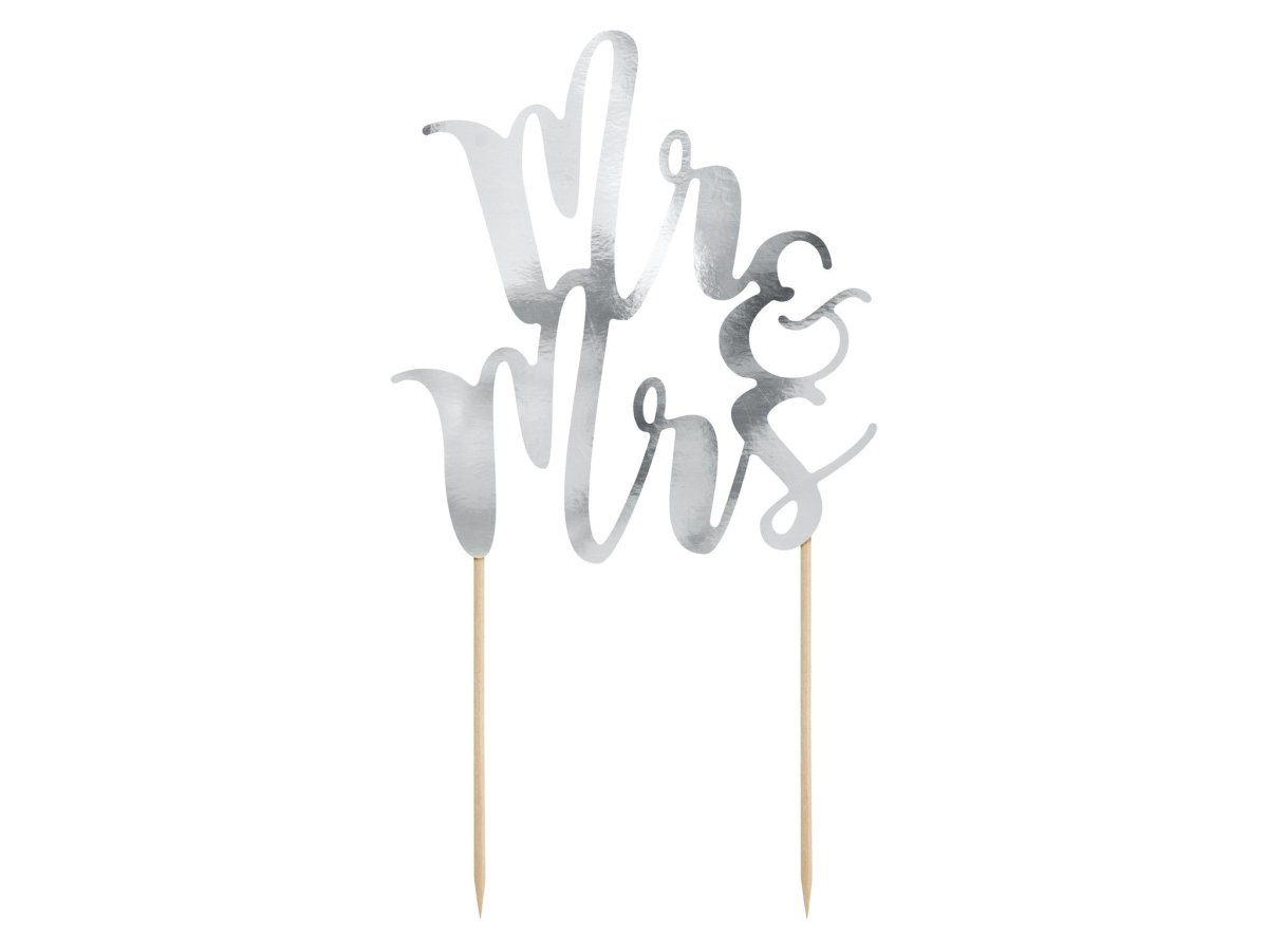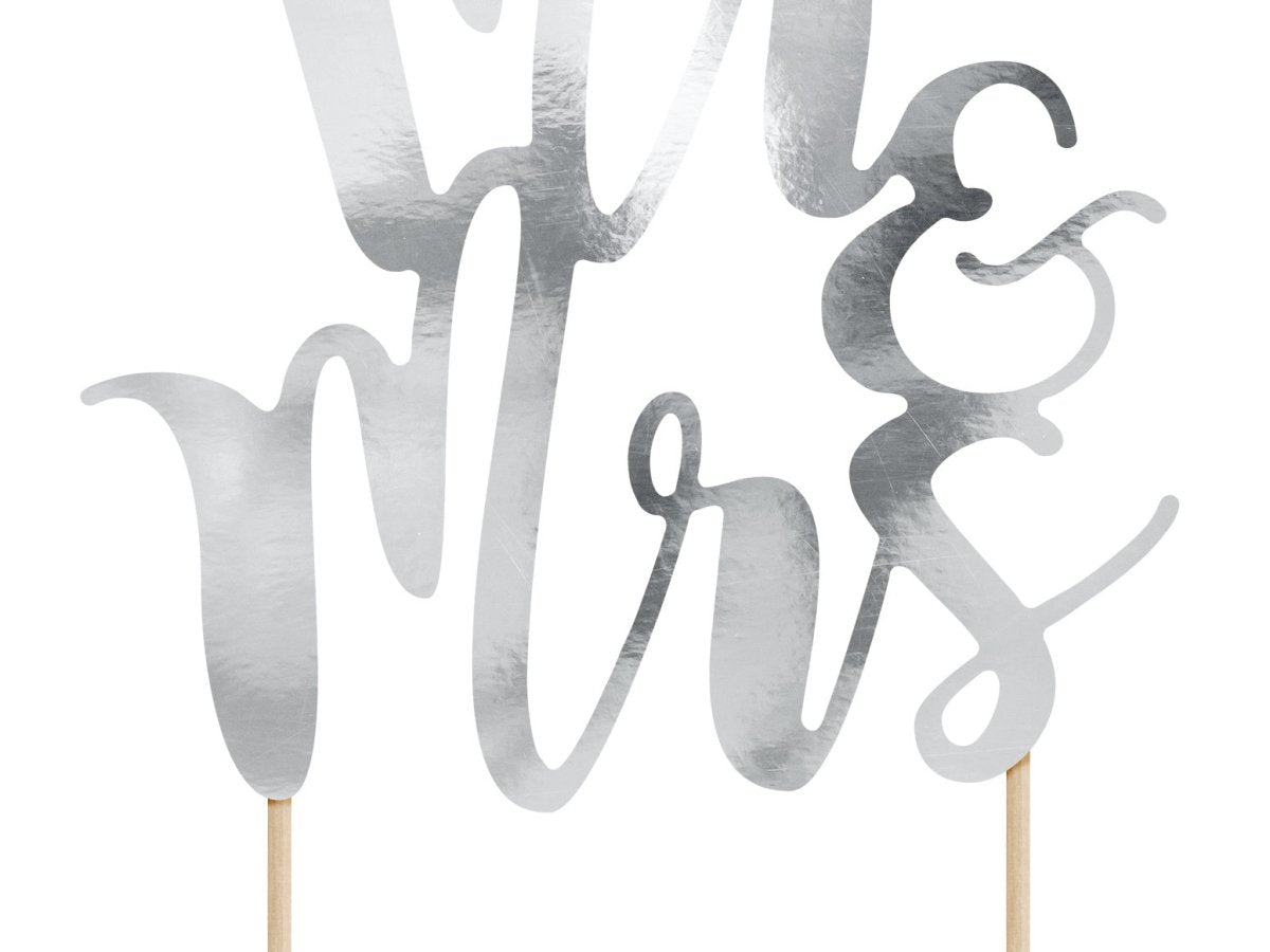 Inhalt: Tortenaufleger Mr & Mrs, aus silbernem Spiegelpapier, Länge ca. 25,5cm.
