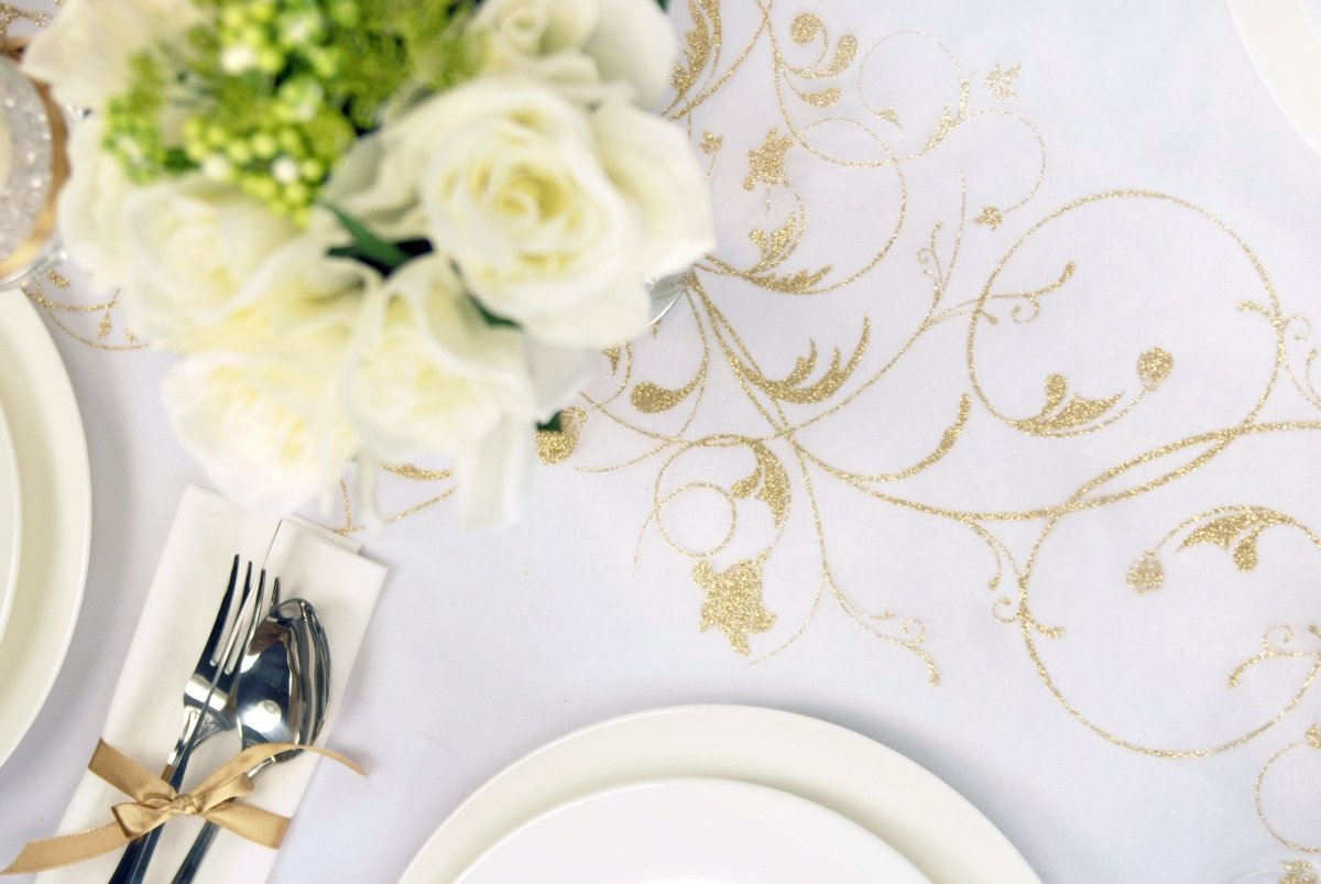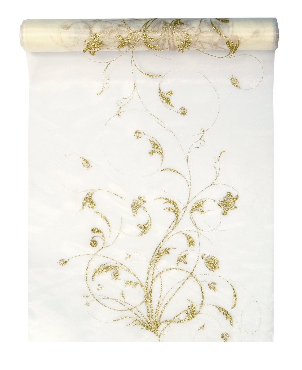 Inhalt: Bedruckter Organza, cremefarben mit einseitigem Goldbrokatdruck, Größe 0,36x9 Meter.