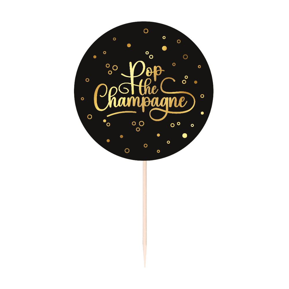 Festliche Zahnstocher in Schwarz mit goldenen Details, perfekt für Snacks, Cupcakes oder andere Leckereien bei Geburtstagen, Silvesterpartys oder anderen festlichen Anlässen.