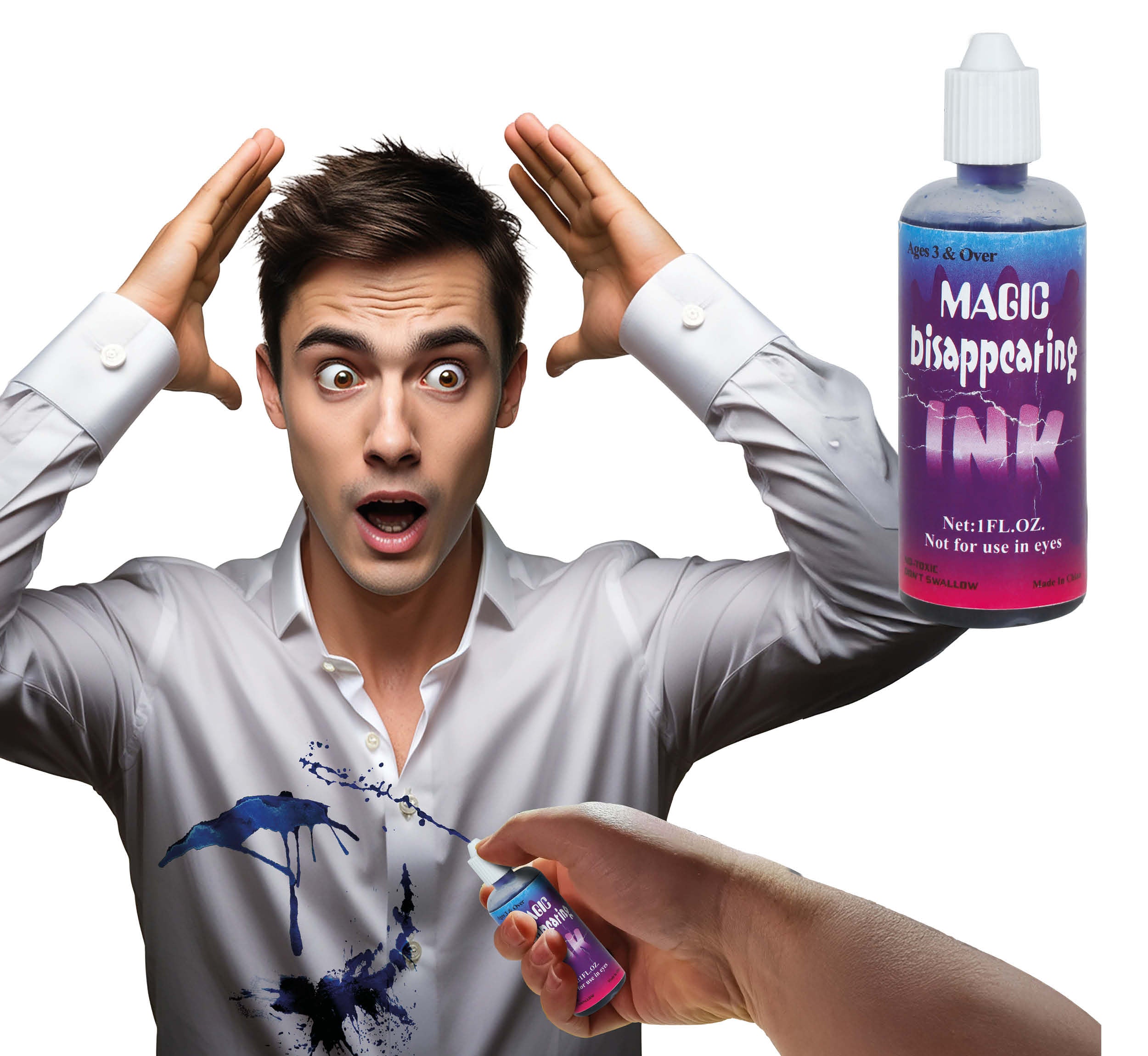 Überrasche deine Freunde mit diesem witzigen Magic Ink Prank! Die blaue "Zaubertinte" hinterlässt einen realistischen Fleck, sobald du sie auf Papier oder Kleidung tropfst, aber... nach kurzer Zeit verschwindet der Fleck von selbst! Perfekt für Fop-Momente, lustige Situationen und als unbeschwertes Geschenk.
